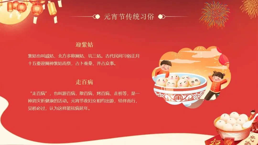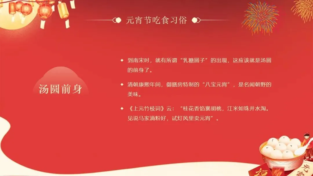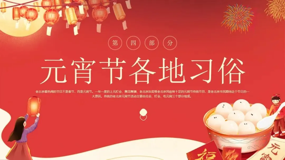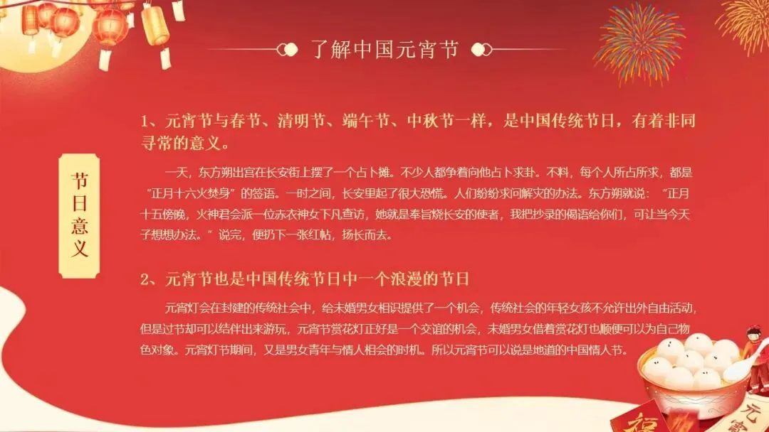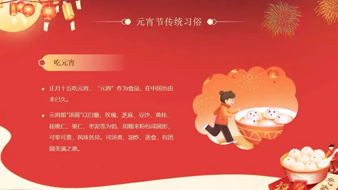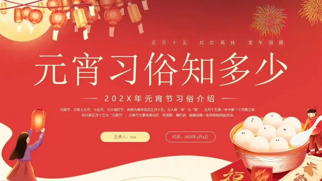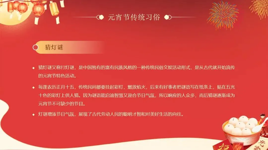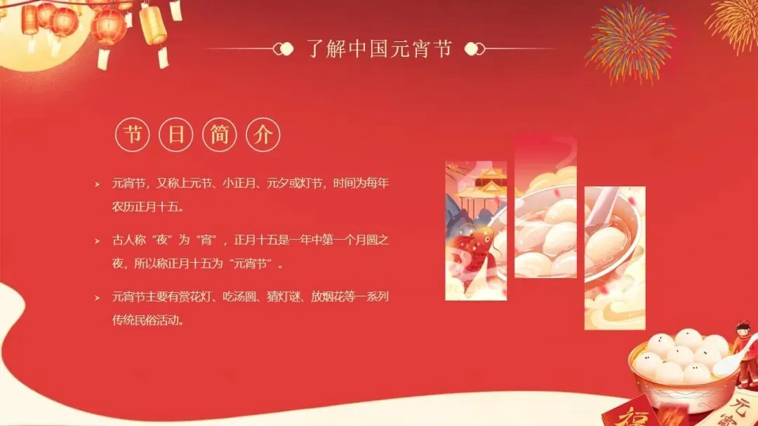 元宵节,又称上元节、小正月、元夕或灯节,时间为每年农历正月十五。古人称“夜”为“宵”,正月十五是一年中第一个月圆之夜,所以称正月十五为“元宵节”。元宵节主要有赏花灯、吃汤圆、猜灯谜、放烟花等一系列传统民俗活动。