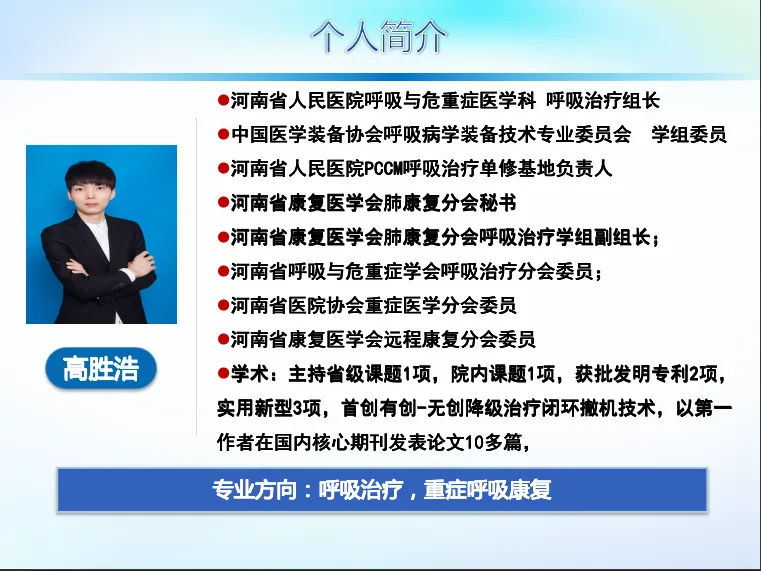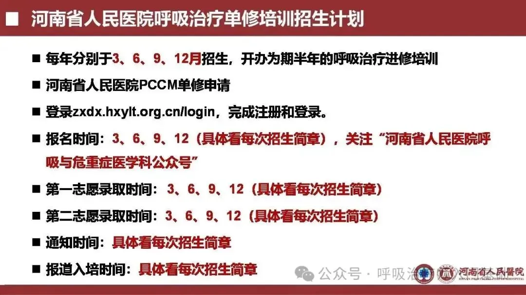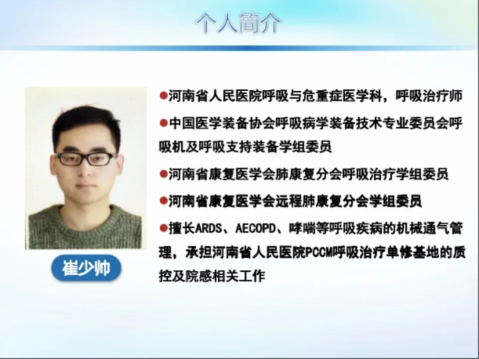 呼吸治疗课程设置: 1.呼吸生理及重要脏器功能受损与呼吸的交互影响 2.呼吸治疗相关的影像知识 3.呼吸治疗评估 4.气道湿化 5.雾化治疗 6.呼吸治疗药理学 7.人工气道管理要点和意外应急处理 8.氧疗 9.血气分析及临床应用 10.呼吸机通气模式及基本原理 11.初始参数设置和调节 12.危急重症疾病病理生理和机械通气策略 13.无创通气及常见问题与处理 14.人工气道、机械通气患者的转运 15.呼吸机安全使用 16.呼吸机装配自检、维护、及使用要点 17.呼吸机波形分析和人机对抗 18.纤支镜技术在人工气道机械通气中的应用 19.呼吸治疗专业团队的组建和管理.