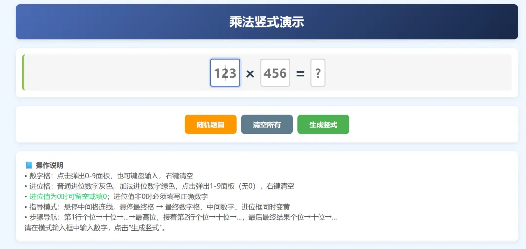 本课件是一个纯前端、零依赖的交互式乘法竖式计算教学工具,旨在通过可视化的步骤、即时反馈与智能指导,帮助学生理解乘法竖式的算理,掌握从个位到高位的逐位计算方法,并熟练处理进位与连续进位。以下从核心练习功能、交互辅助功能、教学支持功能、技术实现特点四个维度进行详细分析。