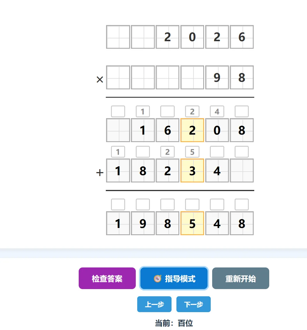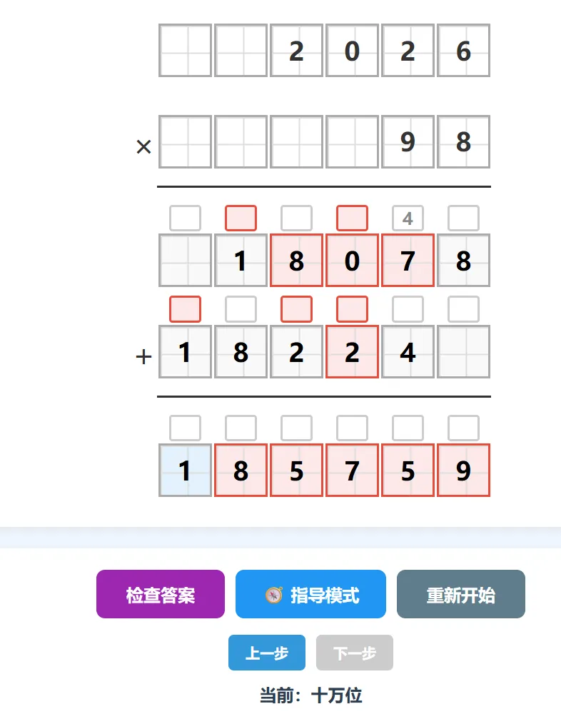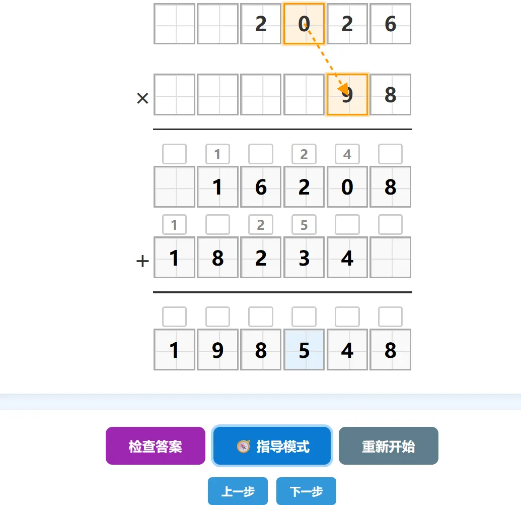 步骤高亮:当前步骤对应的数字大方框显示蓝色背景,同时提示区显示该位的完整计算算式(如8×6+4=52 → 写2,向高位进5)。