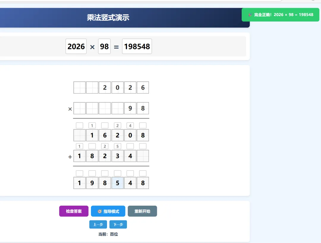 横式结果验证:检查用户填入的最终乘积是否正确,并给出反馈。