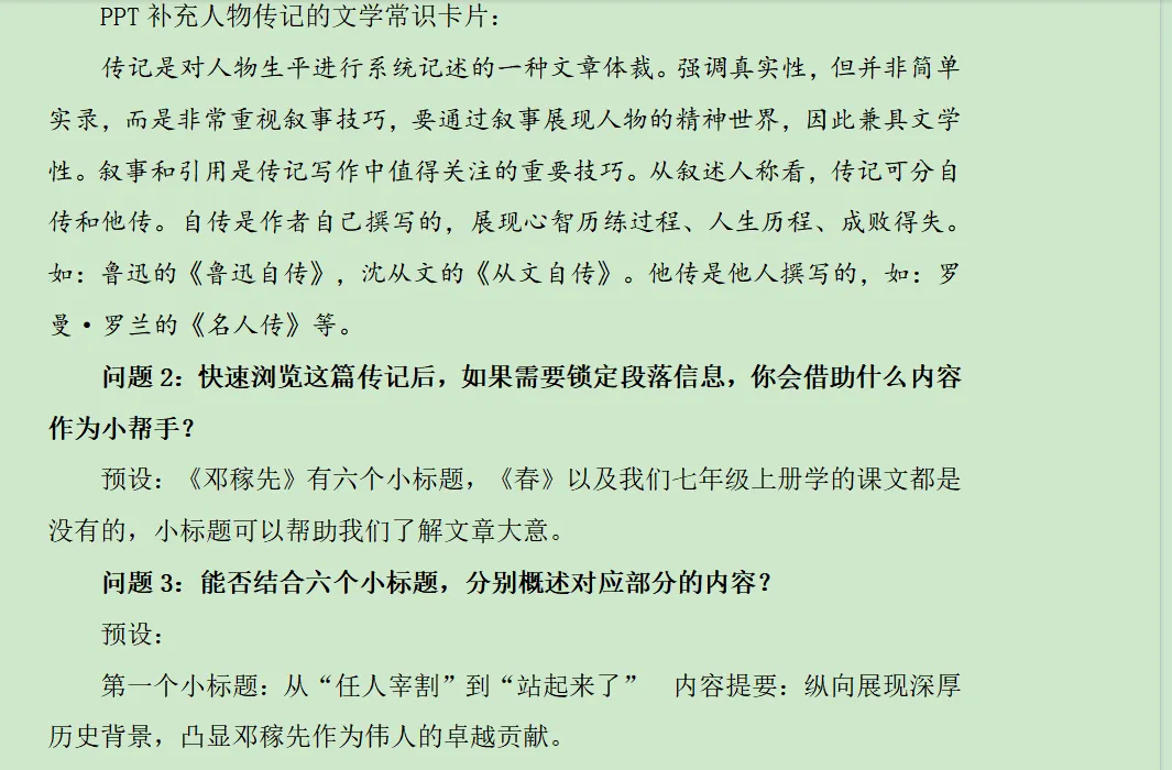 1、精准定位小标题,概括传记六部分内容,把握其逻辑联系。