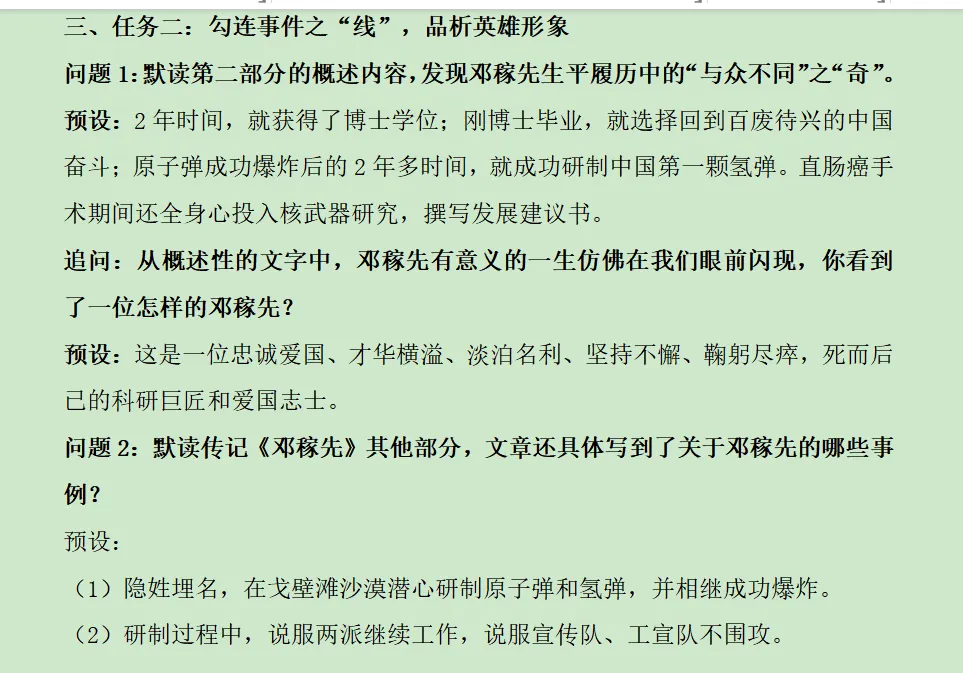 2、品析传记语言,梳理邓稼先重要事迹,剖析人物精神品质。