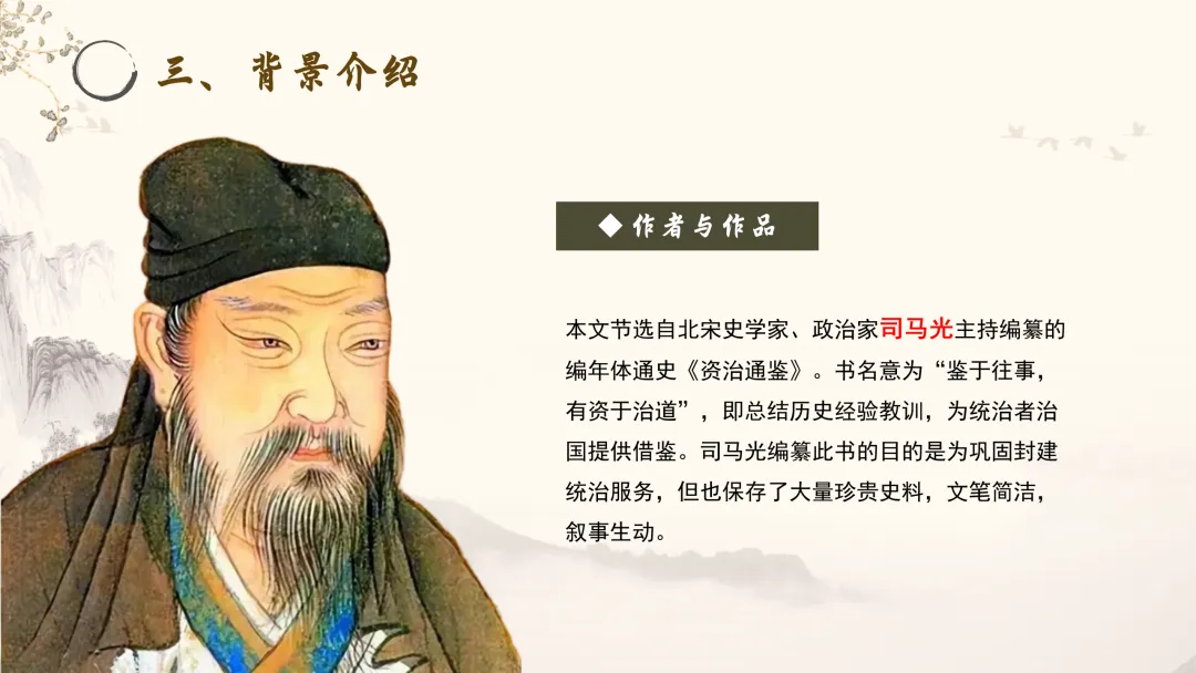 作者与作品:本文节选自北宋史学家、政治家司马光主持编纂的编年体通史《资治通鉴》。书名意为“鉴于往事,有资于治道”,即总结历史经验教训,为统治者治国提供借鉴。司马光编纂此书的目的是为巩固封建统治服务,但也保存了大量珍贵史料,文笔简洁,叙事生动。