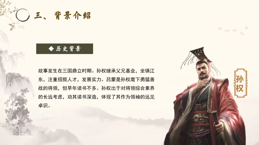 历史背景:故事发生在三国鼎立时期。孙权继承父兄基业,坐镇江东,注重招揽人才,发展实力。吕蒙是孙权麾下勇猛善战的将领,但早年读书不多。孙权出于对将领综合素养的长远考虑,劝其读书深造,体现了其作为领袖的远见卓识。