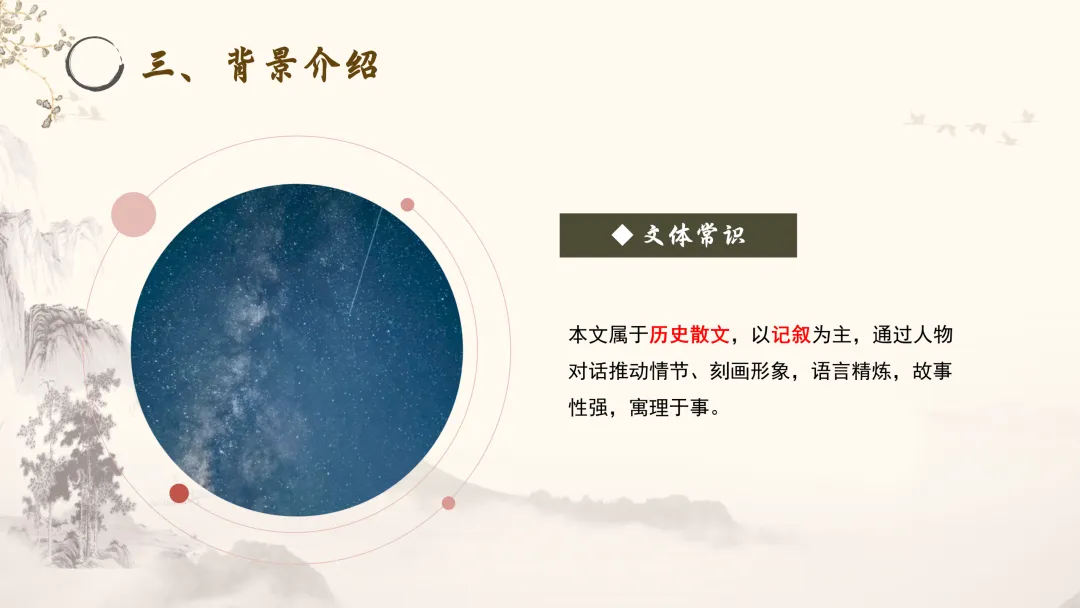 文体常识:本文属于历史散文,以记叙为主,通过人物对话推动情节、刻画形象,语言精炼,故事性强,寓理于事。