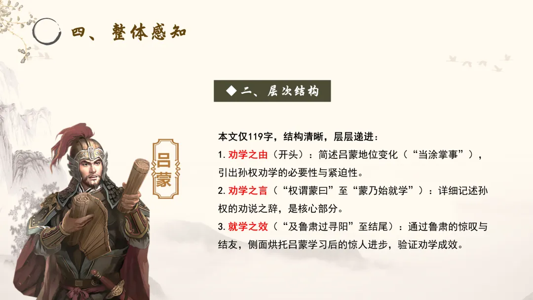 1.劝学之由(开头):简述吕蒙地位变化(“当涂掌事”),引出孙权劝学的必要性与紧迫性。