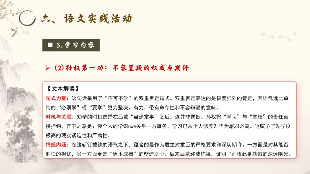 1.点明必要性,直击要害:开篇直指吕蒙现状——“卿今当涂掌事”,身居要职。随即以双重否定“不可不学”强调学习的绝对必要,语气坚决,不容置疑,从责任高度打消其推脱念头。