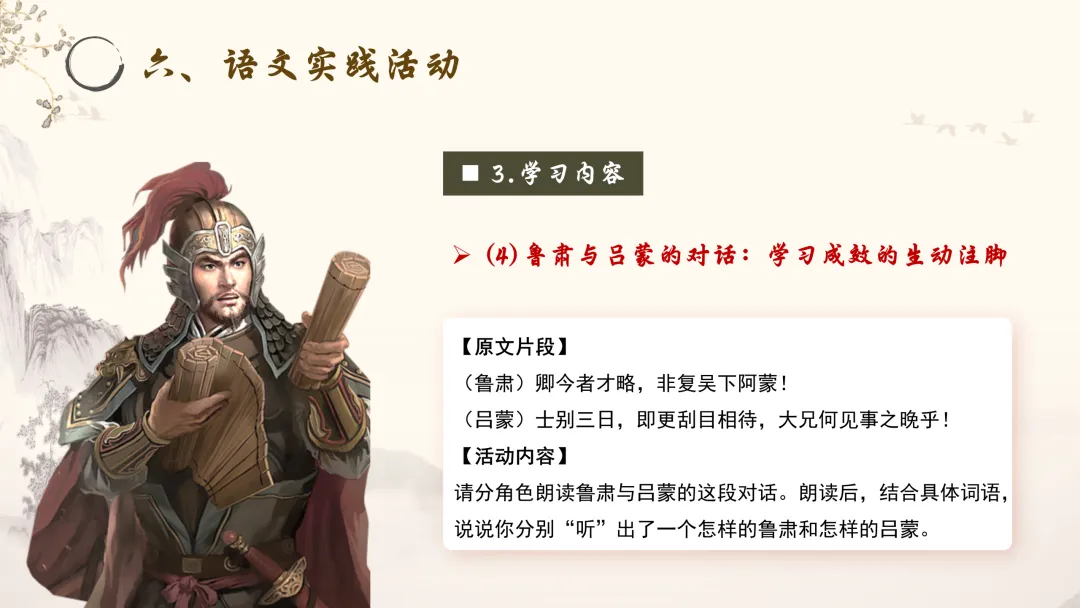 请分角色朗读鲁肃与吕蒙的这段对话。朗读后,结合具体词语,说说你分别“听”出了一个怎样的鲁肃和怎样的吕蒙。
