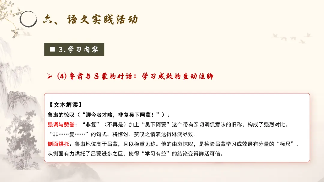 对比与印证:两次对话形成鲜明对比。前一次对话中吕蒙处于被劝、被动的地位;后一次对话中,他则变得自信、主动,甚至能与鲁肃调侃。这种变化,恰恰印证了“学习”所带来的巨大改变,使文章主旨不言自明。