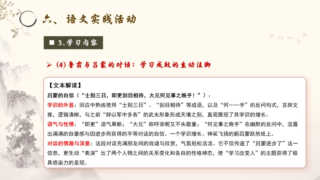 对话的情趣与深意:这段对话充满朋友间的戏谑与欣赏,气氛轻松活泼。它不仅传递了“吕蒙进步了”这一信息,更生动“表演”出了两个人物之间的关系变化和各自的性格神态,使“学习改变人”的主题获得了极具感染力的呈现。