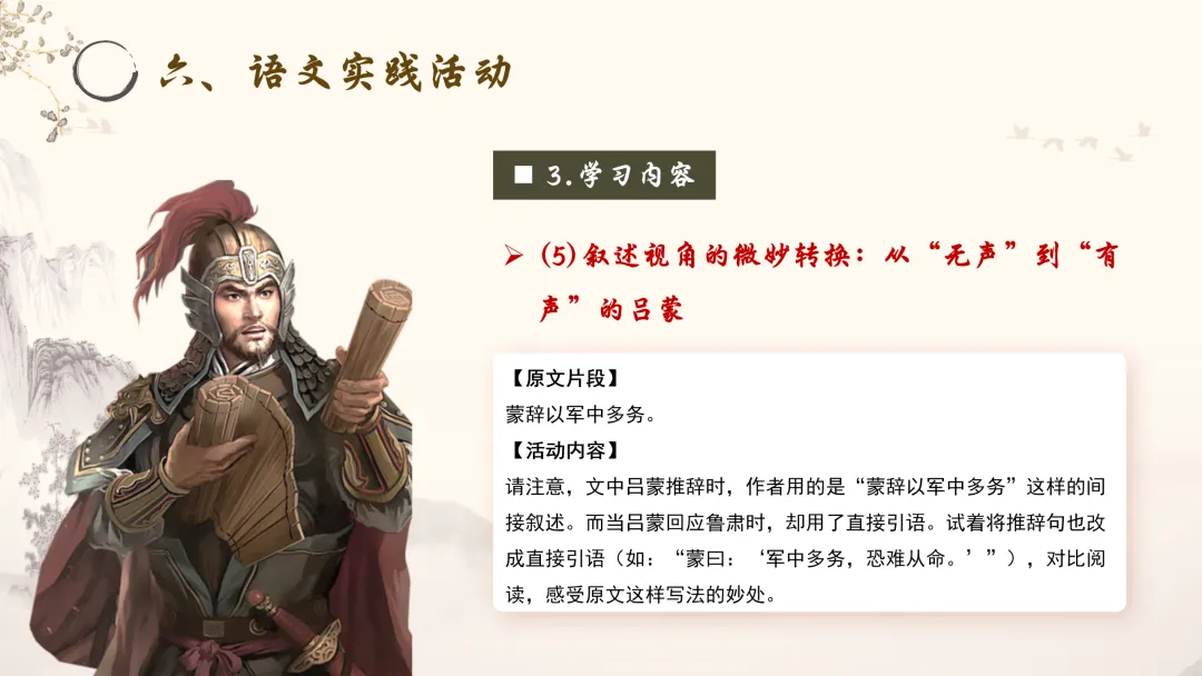 直接引语的魅力:而在与鲁肃对话时,吕蒙获得了“发声”的权利。通过直接引语,他的语言、语气、个性得以充分展现。我们不仅能知道他说了什么,更能感受到他说话时的自豪、风趣与自信。