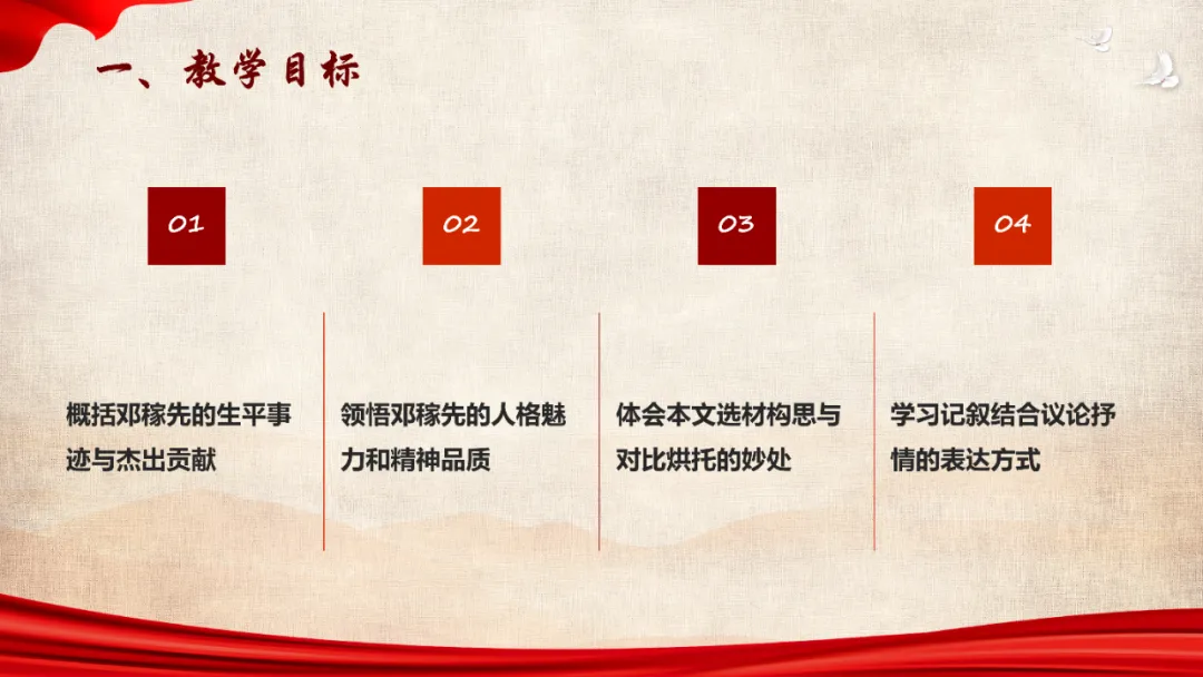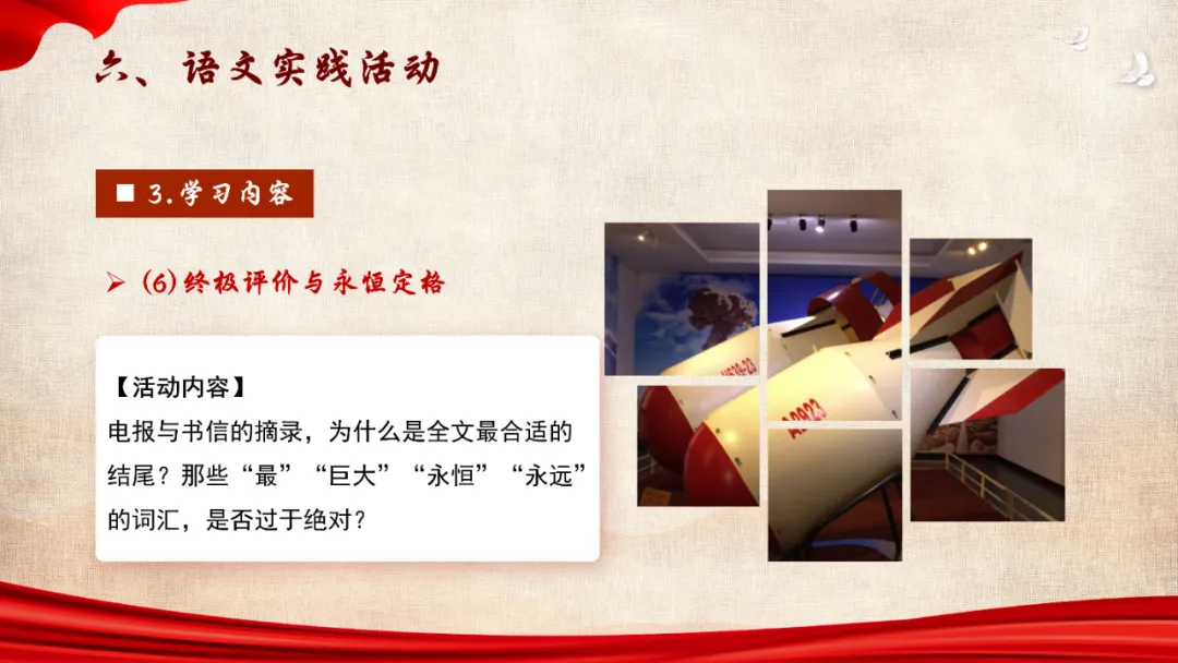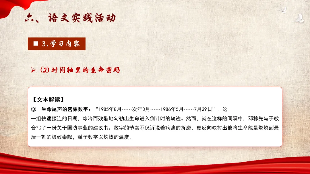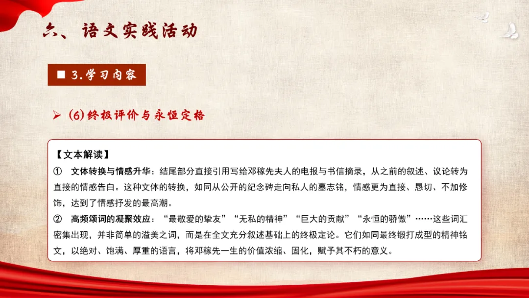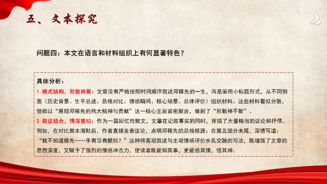 ① 文体转换与情感升华:结尾部分直接引用写给邓稼先夫人的电报与书信摘录,从之前的叙述、议论转为直接的情感告白。这种文体的转换,如同从公开的纪念碑走向私人的墓志铭,情感更为直接、恳切、不加修饰,达到了情感抒发的最高潮。