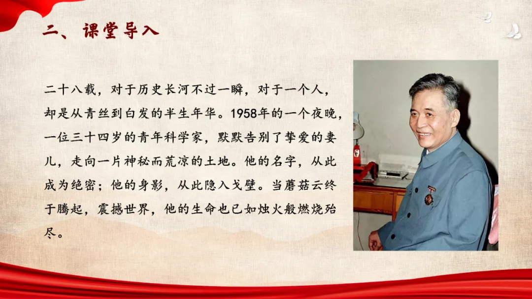 二十八载,对于历史长河不过一瞬,对于一个人,却是从青丝到白发的半生年华。1958年的一个夜晚,一位三十四岁的青年科学家,默默告别了挚爱的妻儿,走向一片神秘而荒凉的土地。他的名字,从此成为绝密;他的身影,从此隐入戈壁。当蘑菇云终于腾起,震撼世界,他的生命也已如烛火般燃烧殆尽。今天,让我们翻开课本,透过杨振宁先生深情的笔触,去触摸那个伟大的灵魂,去聆听那句穿透时空、响彻戈壁的誓言——“我不能走”。