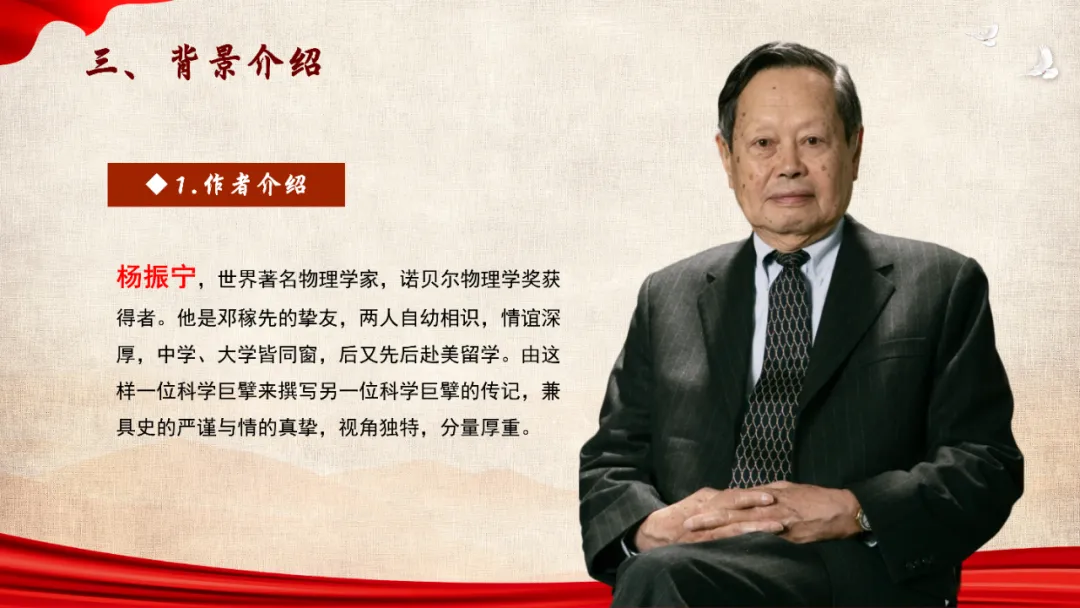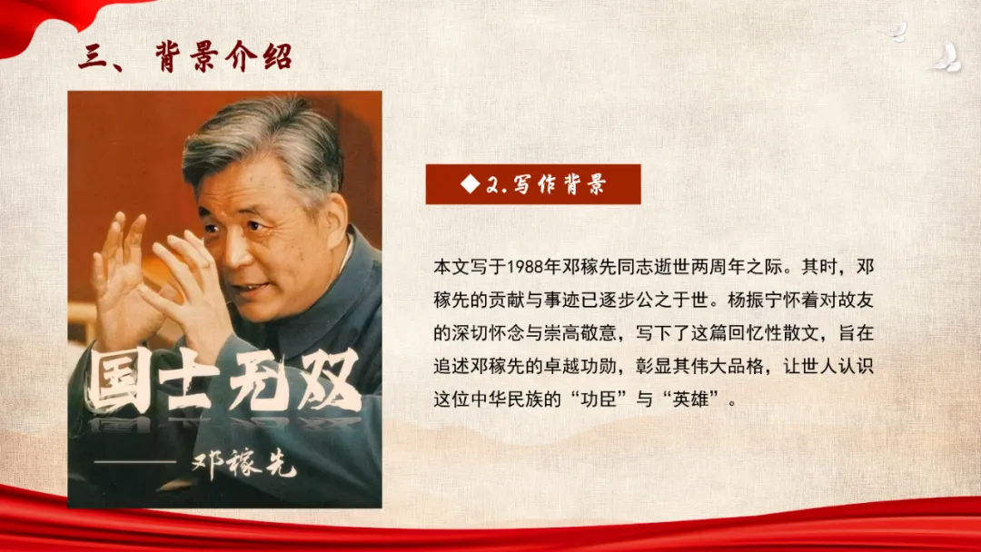 2.写作背景:本文写于1988年邓稼先同志逝世两周年之际。其时,邓稼先的贡献与事迹已逐步公之于世。杨振宁怀着对故友的深切怀念与崇高敬意,写下了这篇回忆性散文,旨在追述邓稼先的卓越功勋,彰显其伟大品格,让世人认识这位中华民族的“功臣”与“英雄”。