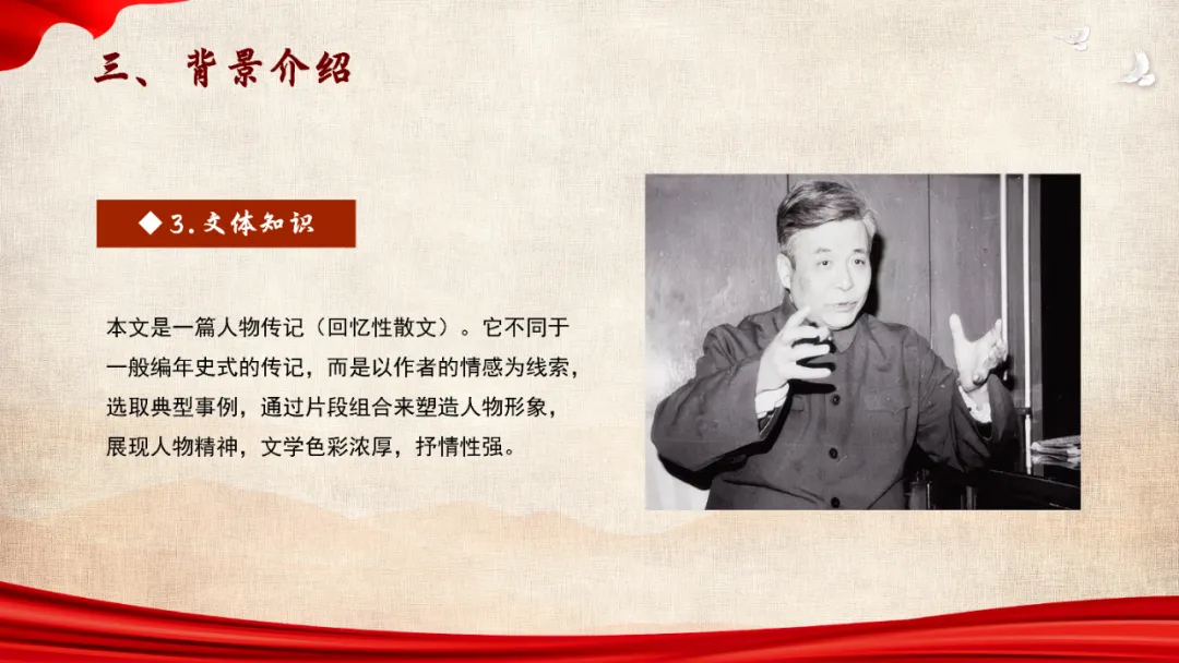 3.文体知识:本文是一篇人物传记(回忆性散文)。它不同于一般编年史式的传记,而是以作者的情感为线索,选取典型事例,通过片段组合来塑造人物形象,展现人物精神,文学色彩浓厚,抒情性强。