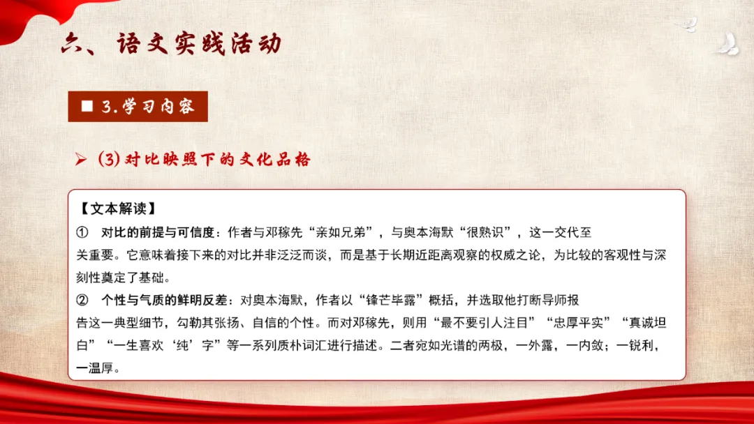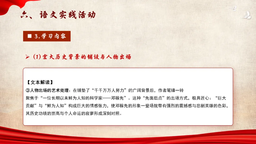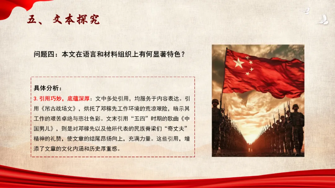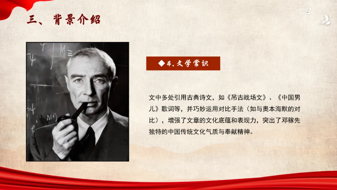 4.文学常识:文中多处引用古典诗文,如《吊古战场文》、《中国男儿》歌词等,并巧妙运用对比手法(如与奥本海默的对比),增强了文章的文化底蕴和表现力,突出了邓稼先独特的中国传统文化气质与奉献精神。