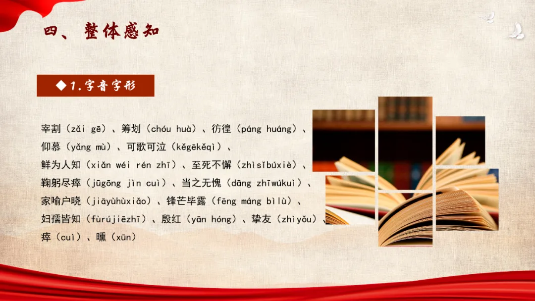 宰割(zǎi gē)、筹划(chóu huà)、彷徨(páng huáng)、仰慕(yǎng mù)、可歌可泣(kěgēkěqì)、鲜为人知(xiǎn wéi rén zhī)、至死不懈(zhìsǐbúxiè)、鞠躬尽瘁(jūgōng jìn cuì)、当之无愧(dāng zhīwúkuì)、家喻户晓(jiāyùhùxiǎo)、锋芒毕露(fēng máng bìlù)、妇孺皆知(fùrújiēzhī)、殷红(yān hóng)、挚友(zhìyǒu)、瘁(cuì)、曛(xūn)