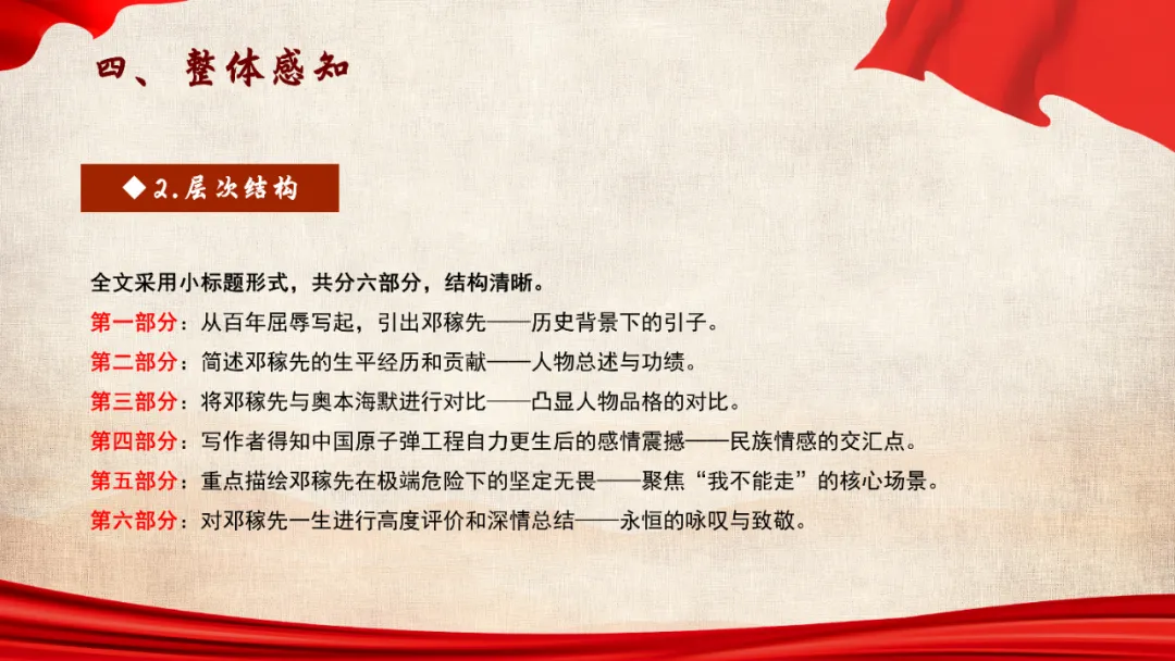 第六部分:对邓稼先一生进行高度评价和深情总结——永恒的咏叹与致敬。