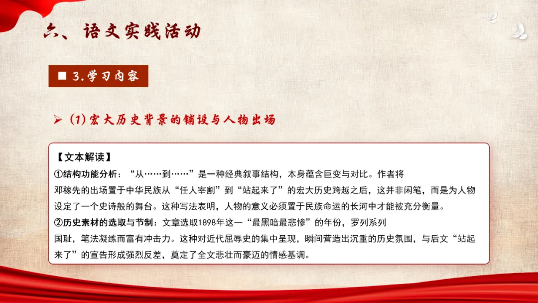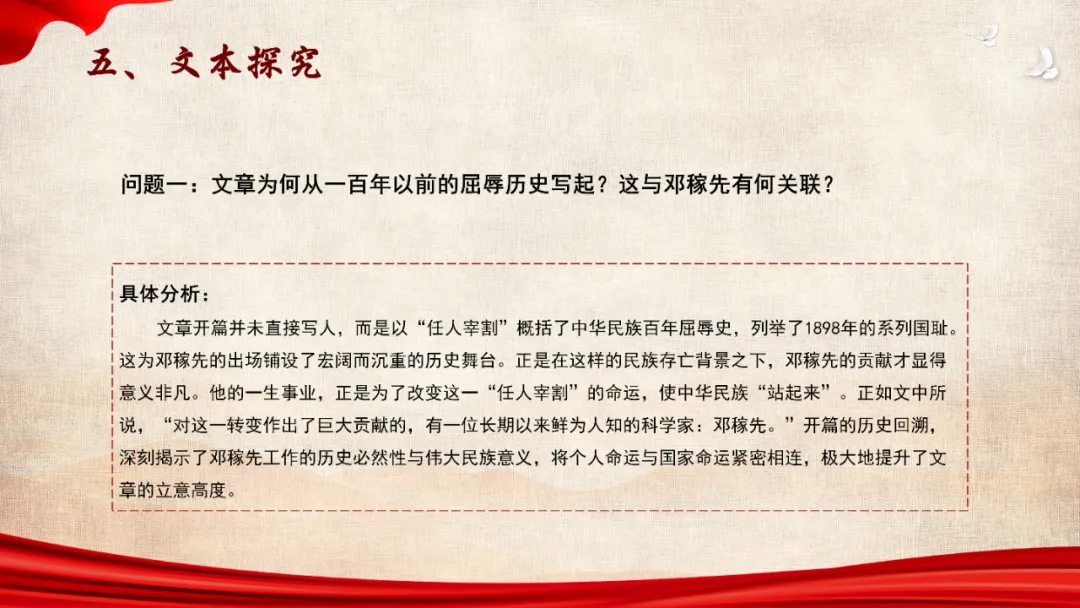具体分析:文章开篇并未直接写人,而是以“任人宰割”概括了中华民族百年屈辱史,列举了1898年的系列国耻。这为邓稼先的出场铺设了宏阔而沉重的历史舞台。正是在这样的民族存亡背景之下,邓稼先的贡献才显得意义非凡。他的一生事业,正是为了改变这一“任人宰割”的命运,使中华民族“站起来”。正如文中所说,“对这一转变作出了巨大贡献的,有一位长期以来鲜为人知的科学家:邓稼先。”开篇的历史回溯,深刻揭示了邓稼先工作的历史必然性与伟大民族意义,将个人命运与国家命运紧密相连,极大地提升了文章的立意高度。
