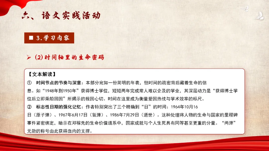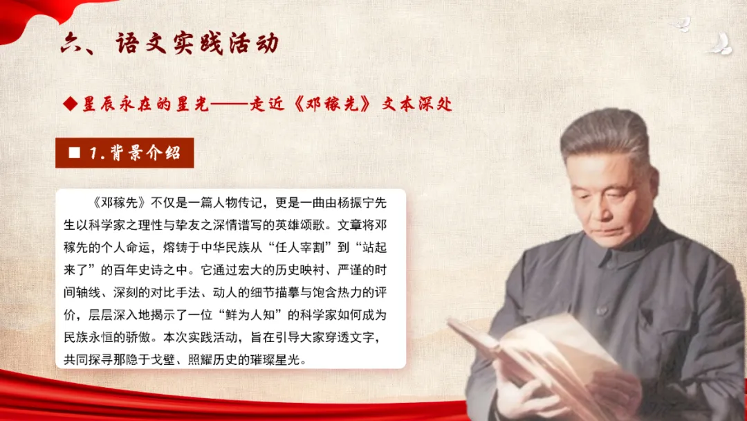 《邓稼先》不仅是一篇人物传记,更是一曲由杨振宁先生以科学家之理性与挚友之深情谱写的英雄颂歌。文章将邓稼先的个人命运,熔铸于中华民族从“任人宰割”到“站起来了”的百年史诗之中。它通过宏大的历史映衬、严谨的时间轴线、深刻的对比手法、动人的细节描摹与饱含热力的评价,层层深入地揭示了一位“鲜为人知”的科学家如何成为民族永恒的骄傲。本次实践活动,旨在引导大家穿透文字,共同探寻那隐于戈壁、照耀历史的璀璨星光。