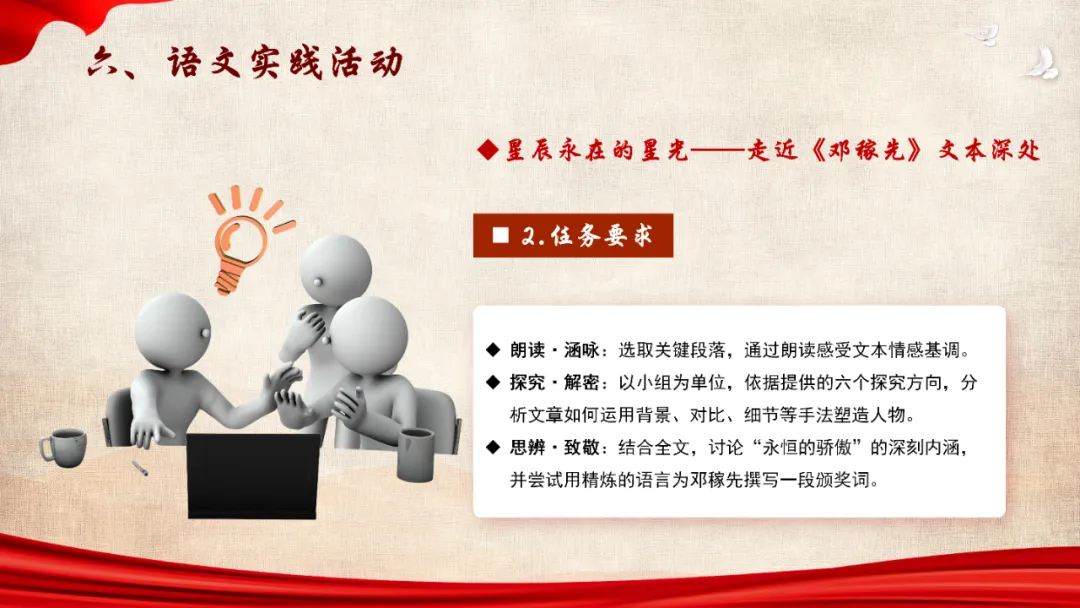 朗读·涵咏:选取关键段落,通过朗读感受文本情感基调。探究·解密:以小组为单位,依据提供的六个探究方向,分析文章如何运用背景、对比、细节等手法塑造人物。思辨·致敬:结合全文,讨论“永恒的骄傲”的深刻内涵,并尝试用精炼的语言为邓稼先撰写一段颁奖词。