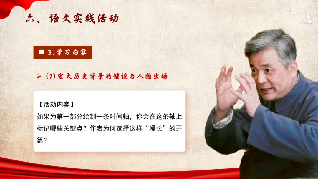 ③ 3.人物出场的艺术处理:在铺垫了“千千万万人努力”的广阔背景后,作者笔锋一转