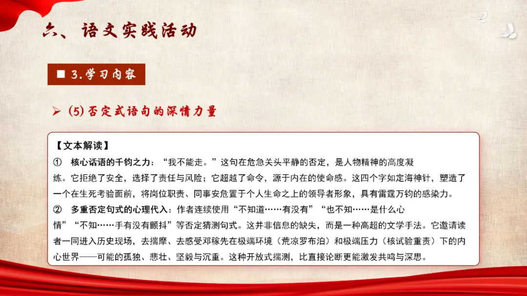 2.叙议结合,情深意切:作为一篇回忆性散文,文章在记叙事实的同时,穿插了大量精当的议论和抒情。例如,在对比奥本海默后,作者直接发表议论,点明邓稼先的品格根源;在第五部分末尾,深情写道:“我不知道稼先……手有没有颤抖?”这种将客观叙述与主观情感评价水乳交融的写法,既增强了文章的思想深度,又赋予了强烈的情感冲击力,使读者既能知其事,更能感其情,悟其神。