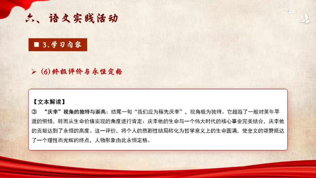 ③ “庆幸”视角的独特与崇高:结尾一句“我们应为稼先庆幸”,视角极为独特。它超越了一般对英年早逝的惋惜,转而从生命价值实现的角度进行肯定:庆幸他的生命与一个伟大时代的核心事业完美结合,庆幸他的贡献达到了永恒的高度。这一评价,将个人的悲剧性结局转化为哲学意义上的生命圆满,使全文的颂赞抵达了一个理性而光辉的终点,人物形象由此永恒定格。