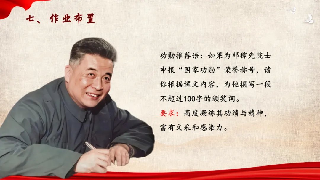 功勋推荐语:如果为邓稼先院士申报“国家功勋”荣誉称号,请你根据课文内容,为他撰写一段不超过100字的颁奖词。要求:高度凝练其功绩与精神,富有文采和感染力。