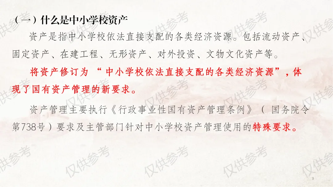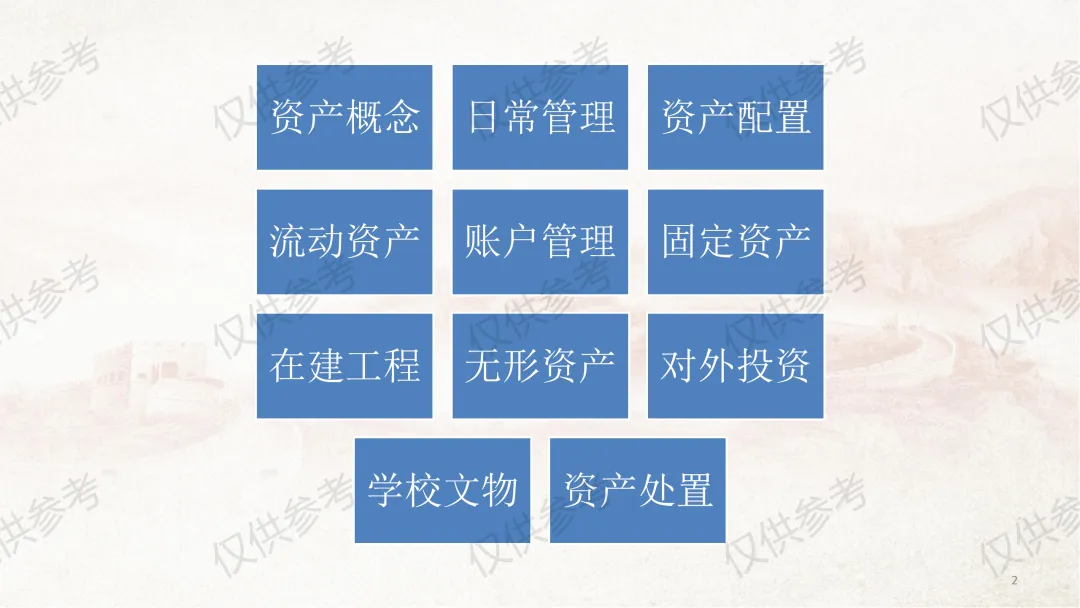 本课件对照《中小学校财务制度》第八章“资产管理”编制,围绕资产概念、日常管理、资产配置、流动资产、账户管理、固定资产、在建工程、无形资产、对外投资、学校文物、资产处置11个方面进行展开和延伸编辑。