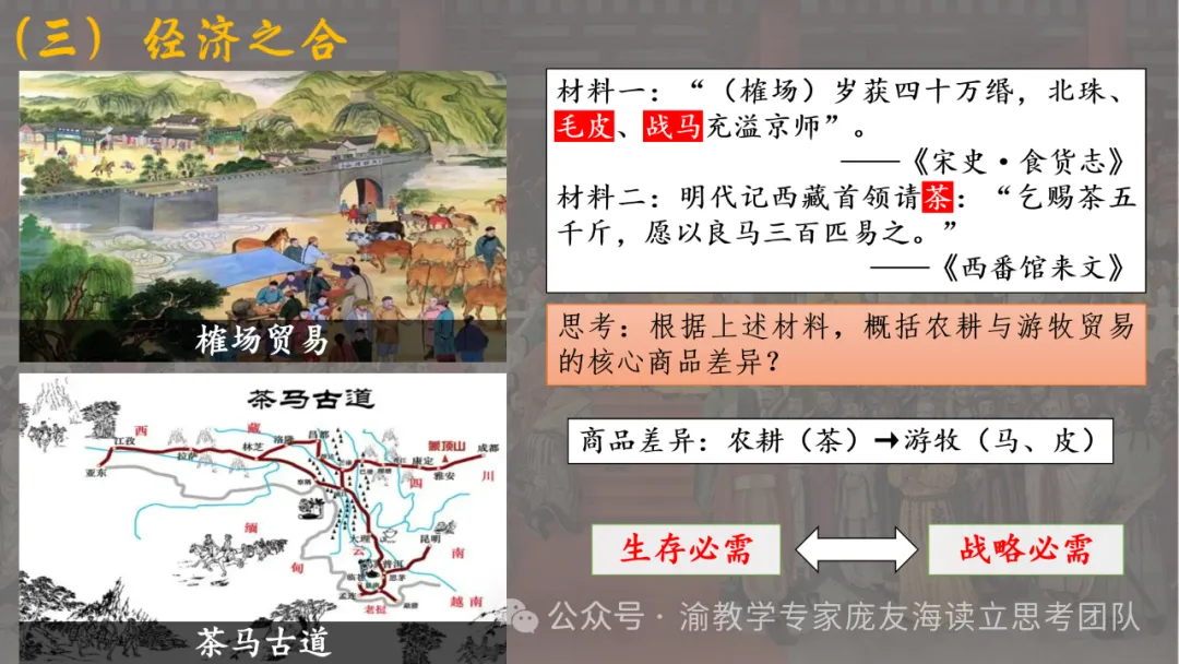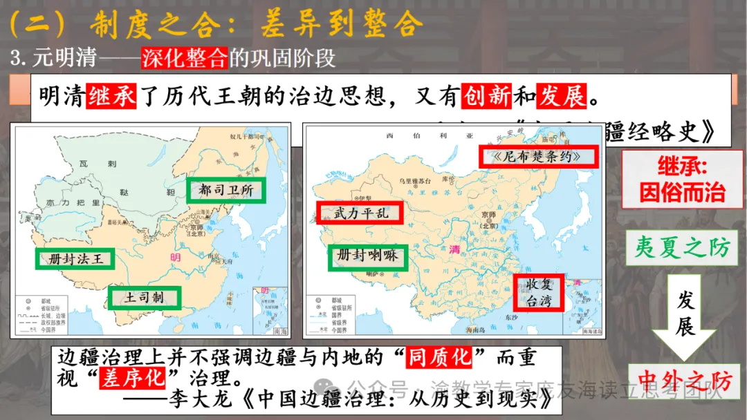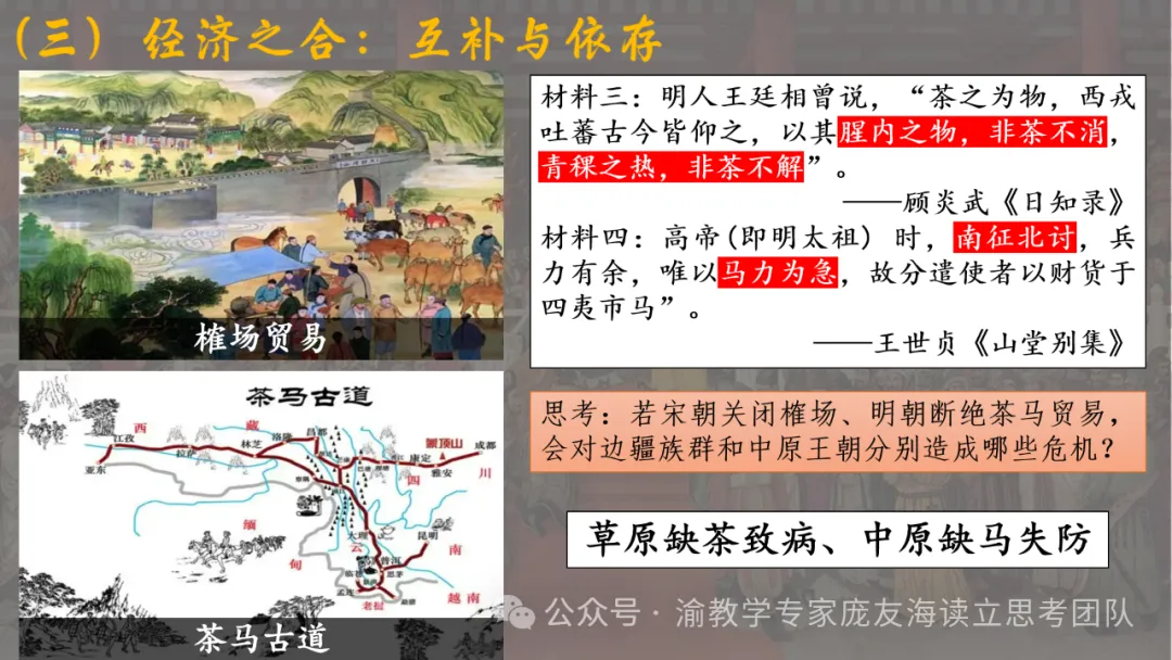 今天推介巴南区骨干教师、重庆清华中学叶青山老师的《中国古代的民族关系与对外交往》。本课件内容丰富,结构清晰,以朝代为序,系统梳理了中国古代的民族关系与对外交往。通过具体历史事件和案例,生动展示了各朝代在民族治理和对外关系方面的策略与成效,如秦汉的羁縻政策、隋唐的边疆管理机构、元明清的边疆治理创新等。同时,还深入探讨了农耕与游牧贸易的核心商品差异及其影响,以及中国古代对外交往的特点与意义。从课件上看,部分历史细节略显简略,未能充分展开深入讨论,部分图片和图表未能有效辅助理解。但整体而言,该课件是学习中国古代民族关系与对外关系的优质资源,有助于学生全面了解中国古代在多元一体的民族格局下的国家治理智慧与对外交往策略。值得学习和借鉴。特此推介。