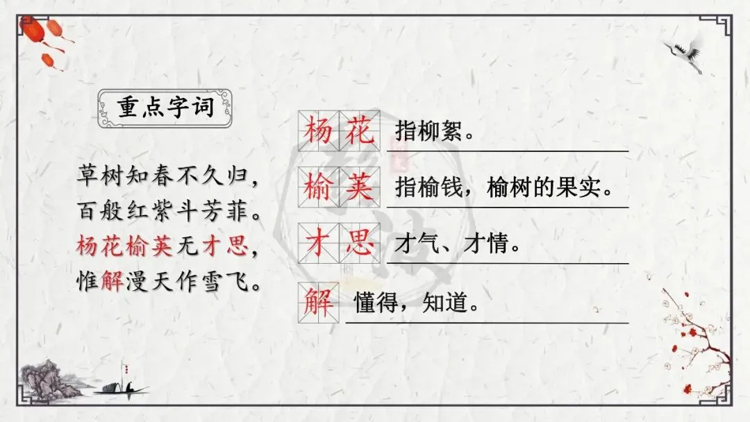 (2)表颜色的词:颜色一般表现心情,增强描写的色彩感和画面感,渲染气氛。欣赏时,或抓住能表现色彩组合的字眼,体会诗歌的浓郁的画意与鲜明的节奏:“两个黄鹂鸣翠柳,一行白鹭上青天”,黄、翠、白、青四种颜色,点缀得错落有致,而且由点到线,向着无限的空间延伸,画面静中有动,富有鲜明的立体节奏感。