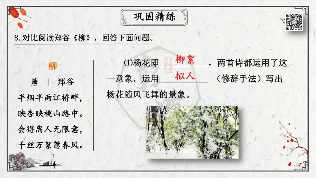 (1)叠词:叠词作用不外两种:增强语言的韵律感或是起强调作用。杨柳青青江水平,闻郎江上唱歌声。(《其一》刘禹锡)