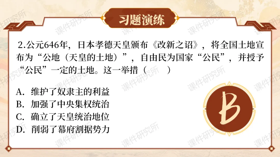 1、版权声明:本课件为课件研究所团队原创课件,受《中华人民共和国著作权保护法》《信息网络传播权条例》等相关律法的保护,如若发现未经我方允许,非法盗版使用、倒卖、肆意传播、私下拼单本课件的恶劣行为,我方将坚决拿起法律的武器维护自己的权利。我方已与“四川省西川律师事务所”达成长期战略合作协议,所有侵权事件,我方将授权律所全权代为起诉。法不可违,切勿因小失大。