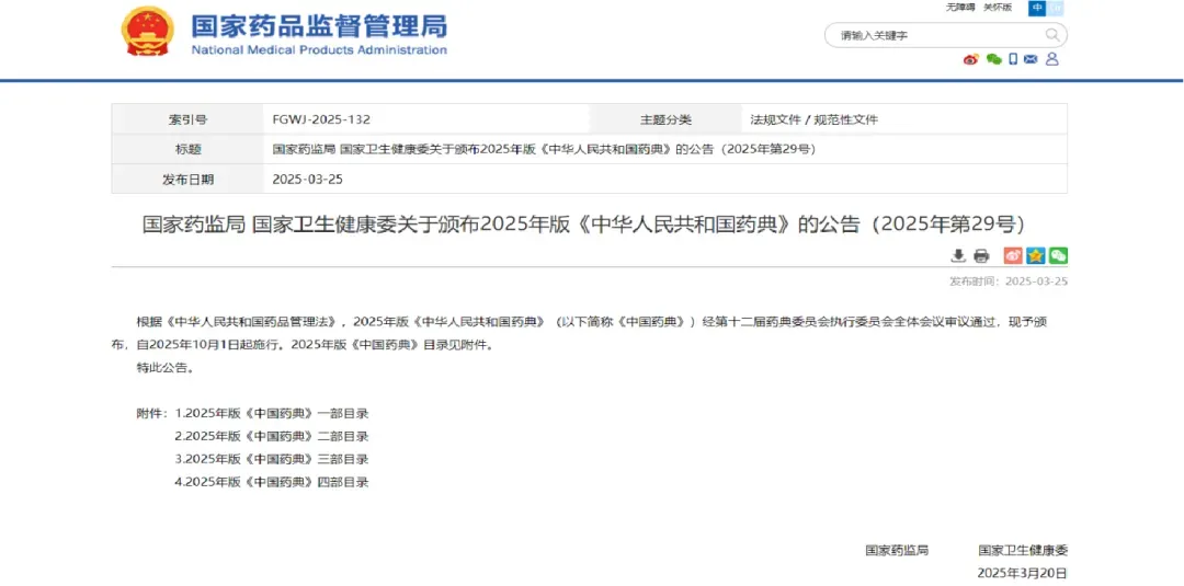2025年3月20日,国家药监局国家卫生健康委颁布最新版--即2025版《中国药典》的公告,2025版中国药典共分一、二、三、四部内容,自2025年10月1日起施行。