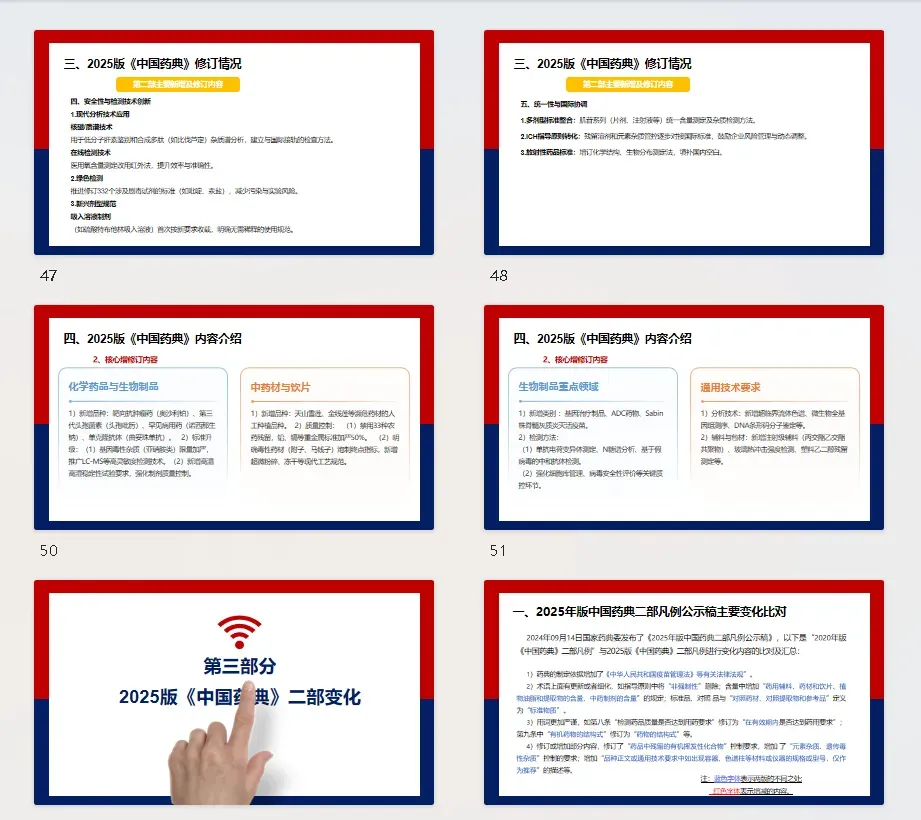 以下是2025版《中国药典》基础知识学习培训课件,课件中不光有药典的发展历史沿革详细介绍、以及药典组成内容介绍、还有与以往药典不同之处的比对等多方面关键内容。