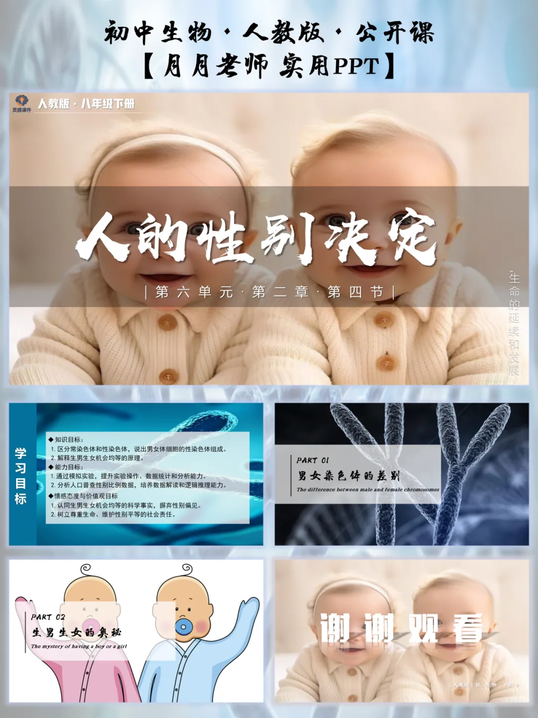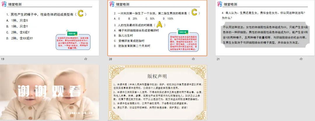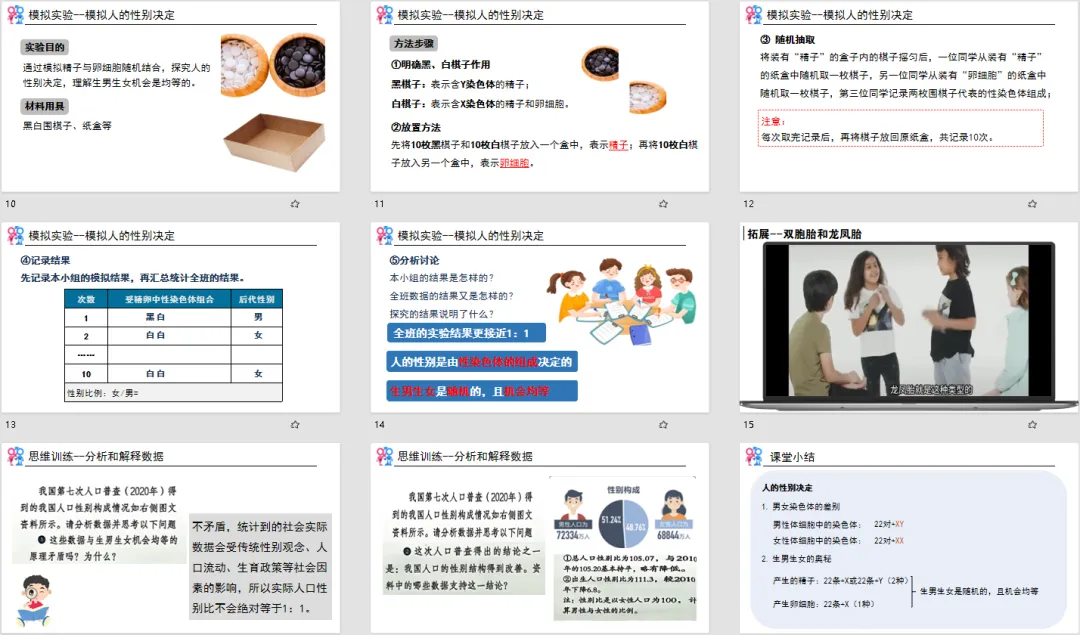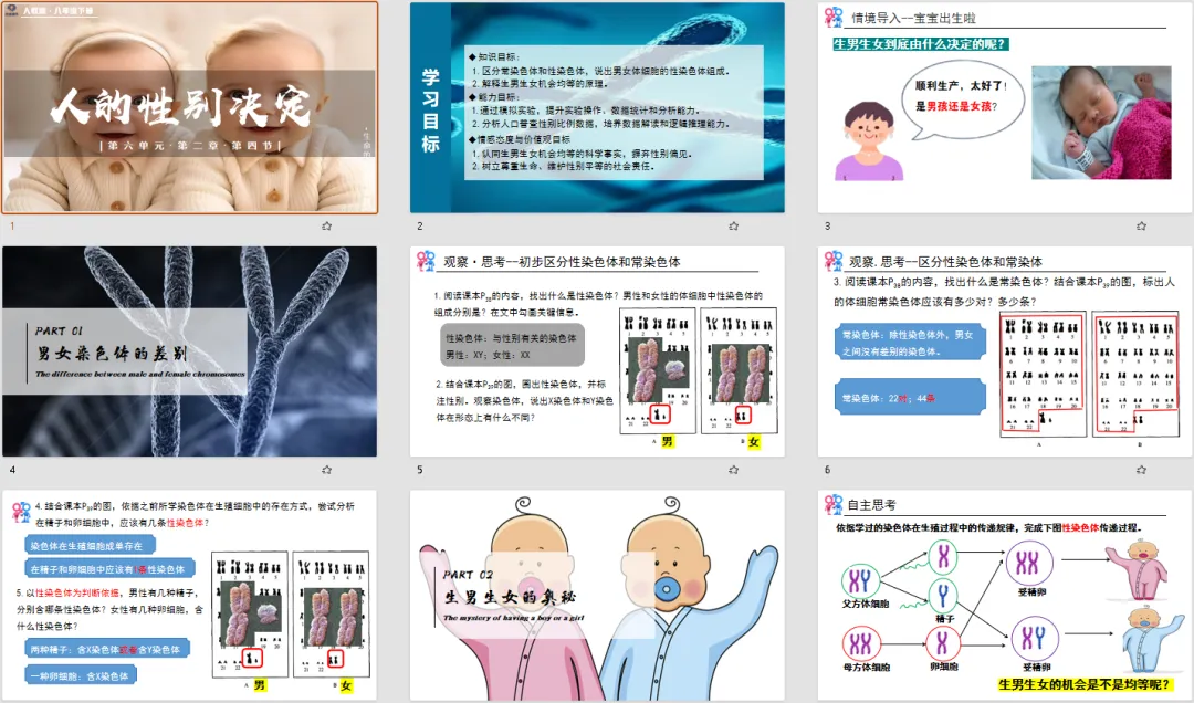 没有生硬的知识灌输,而是从学生最熟悉的生活场景切入,精准击中他们的好奇心。学生带着 “想揭开谜底” 的心态进入课堂,比被动听讲更有学习动力,也让 “性别决定” 这个话题变得亲切又接地气,为后续知识讲解做好了完美铺垫。