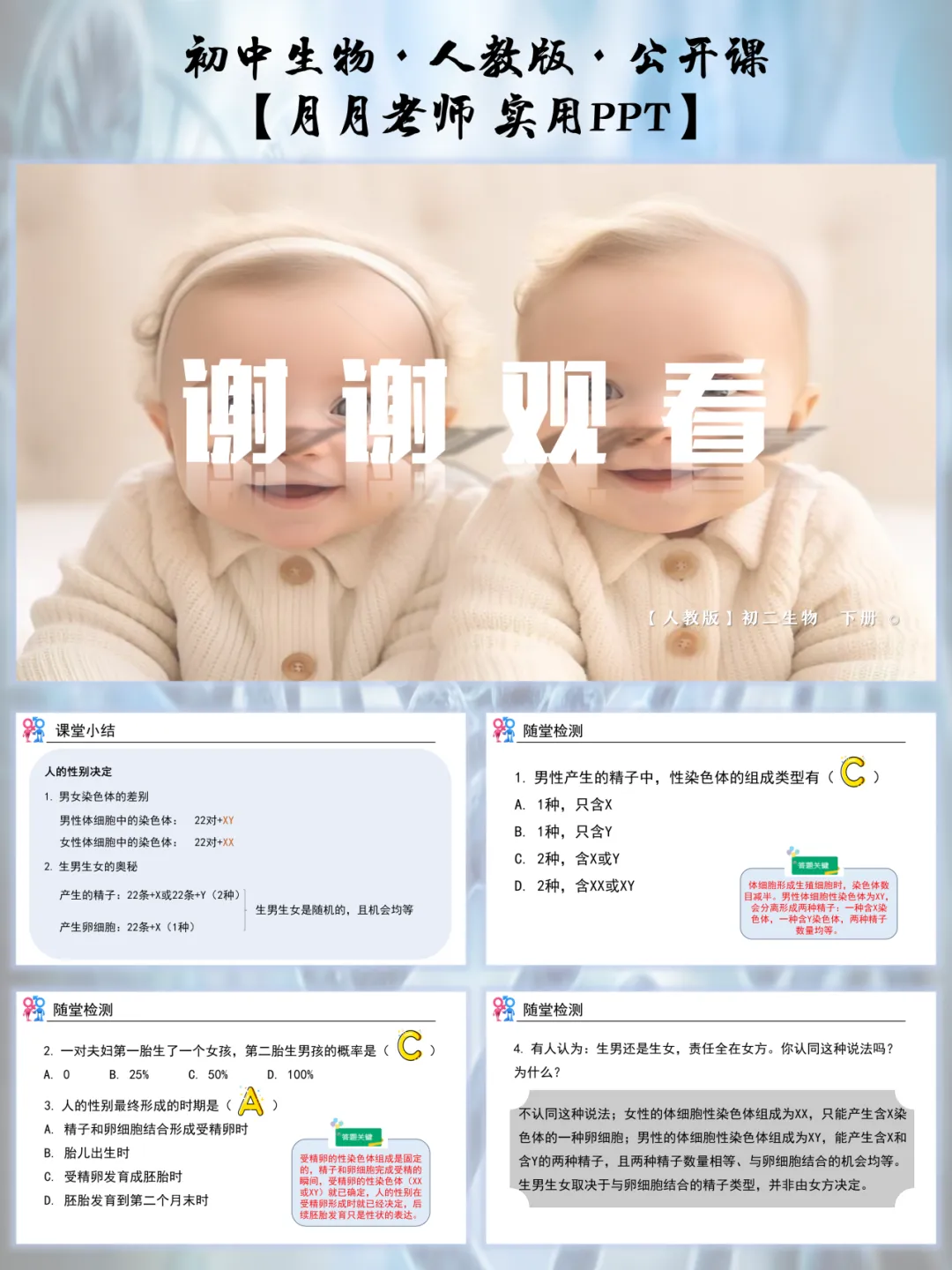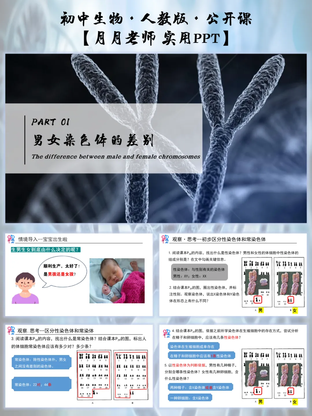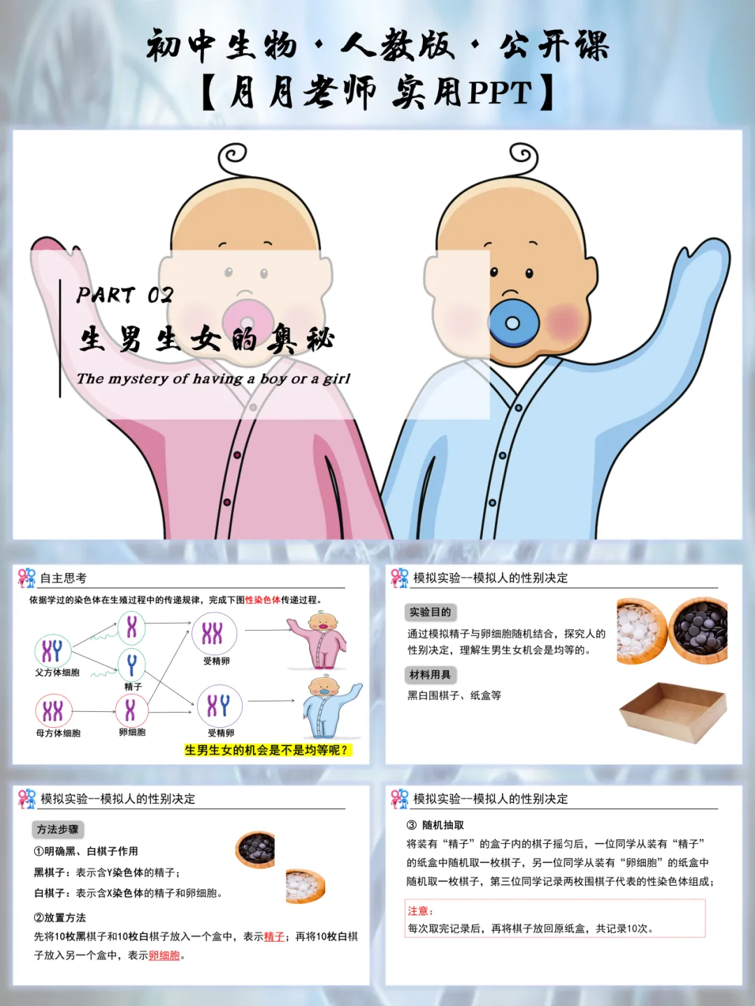 生男生女的话题,学生从小就好奇,这节课的导入太懂抓注意力了!播放 “宝宝出生” 的生活情境图,抛出灵魂提问:“宝宝的性别是啥决定的?随机的还是有规律的?”,让学生自由分享自己的猜测。
