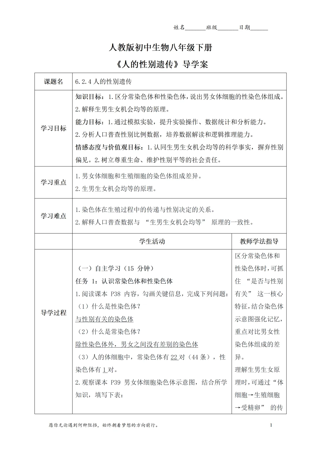 男女染色体的差别是本节课的基础,也是学生容易混淆的点,这份设计用“观察 + 阅读 + 提问 + 总结” 的四步法,把知识讲得明明白白:先展示男女体细胞染色体示意图,让学生直观观察差异;再引导阅读课本,找出常染色体和性染色体的定义;接着通过连环提问,梳理出 “男女常染色体均 22 对,性染色体男性 XY、女性 XX” 的核心结论;最后延伸到生殖细胞,推导出 “精子有 X/Y 两种,卵细胞只有 X 一种” 的关键知识点。