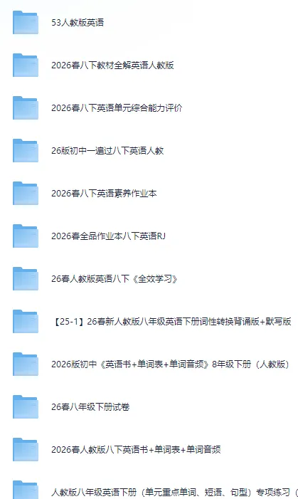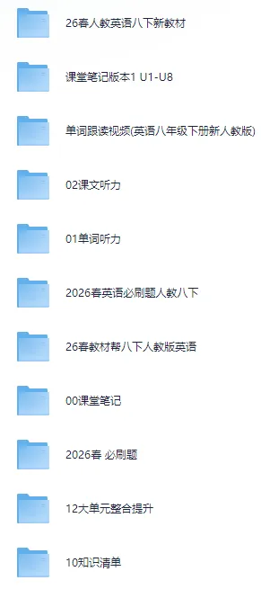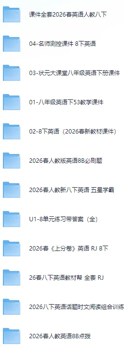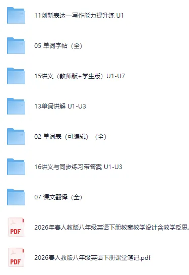 本文收集的教学资源是2026春人教版英语八下课件教案教辅必刷题素养作业本试卷课堂笔记教学设计翻译单元练习单词课文听力音频阅读训练重难点解析,最新优质资源,全部存放于网盘,网盘部分资源截图如下: