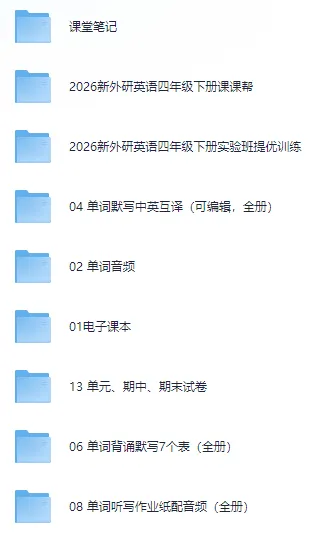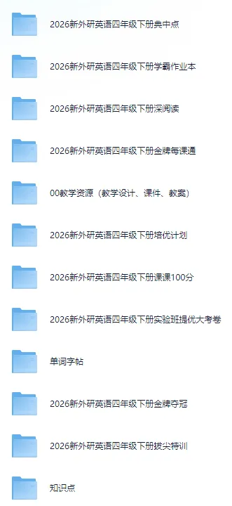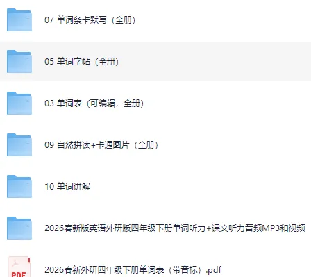 本文收集的教学资源是2026春新外研版英语四下课件教案教辅作业试卷课堂笔记字帖单元重点知识清单课文翻译单词音频默写同步练习课课练电子课本最新优质资源,全部存放于网盘,网盘部分资源截图如下: