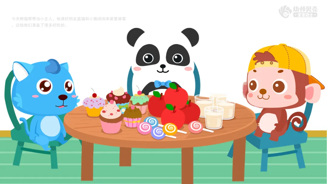 ——(教师头戴熊猫奇奇头饰)今天熊猫奇奇当小主人,他请好朋友蓝猫和小猴闹闹(不同幼儿扮演)来家里做客,还给他们准备了很多好吃的。