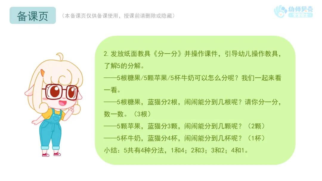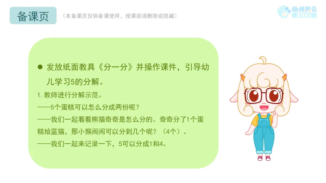 l发放纸面教具《分一分》并操作课件,引导幼儿学习5的分解。