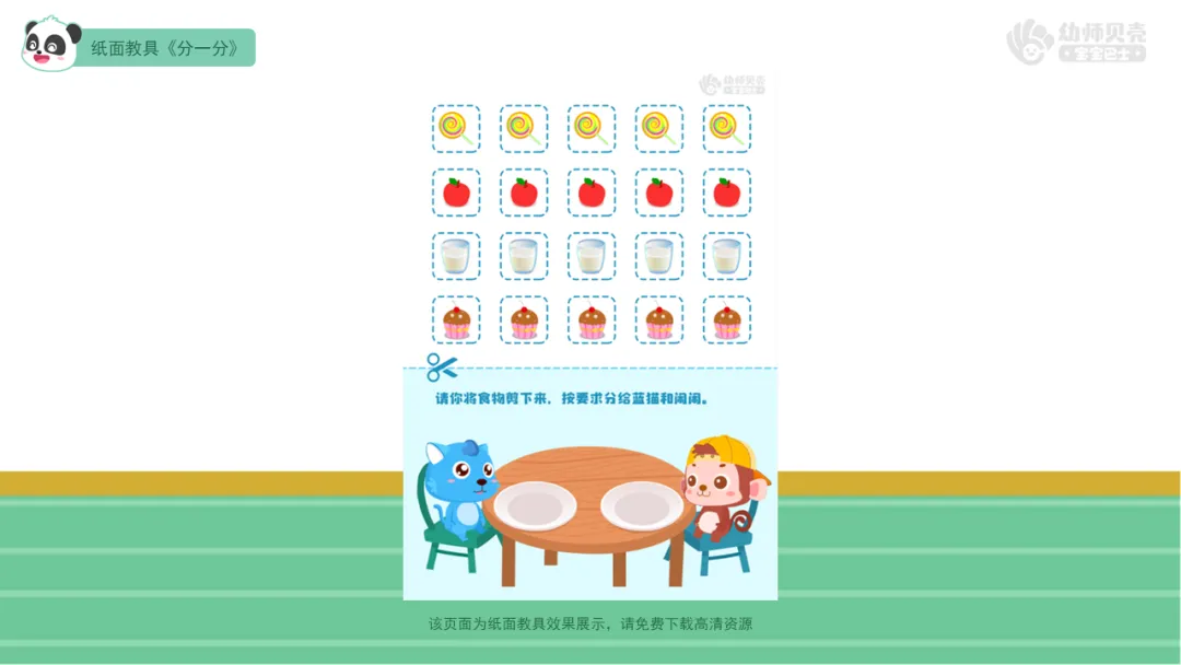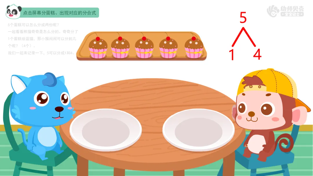 ——我们一起看看熊猫奇奇是怎么分的。奇奇分了1个蛋糕给蓝猫,那小猴闹闹可以分到几个呢?(4个)。