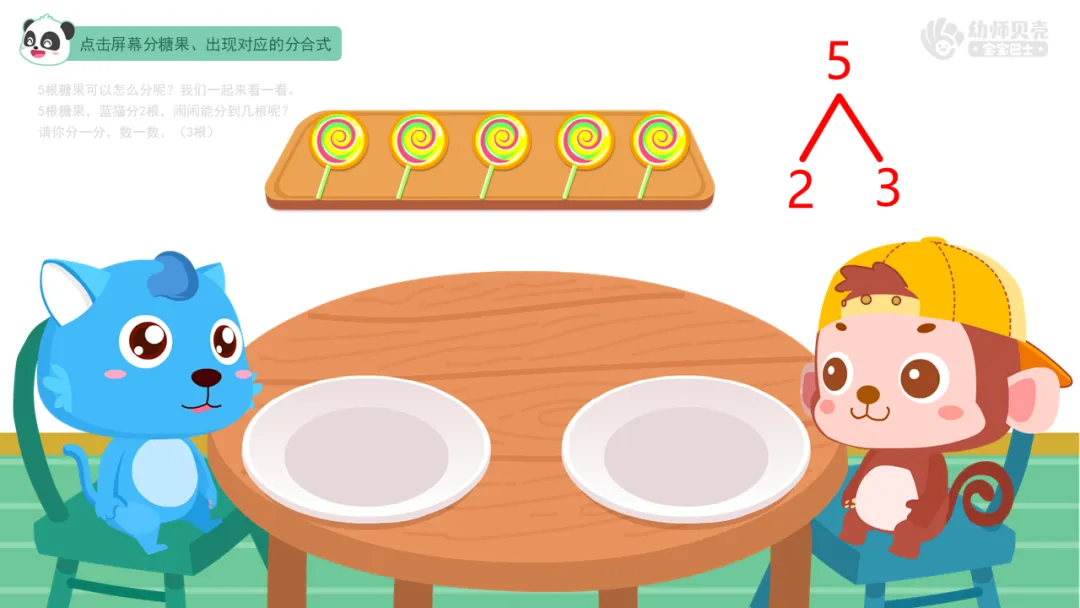 ——5根糖果,蓝猫分2根,闹闹能分到几根呢?请你分一分,数一数。(3根)