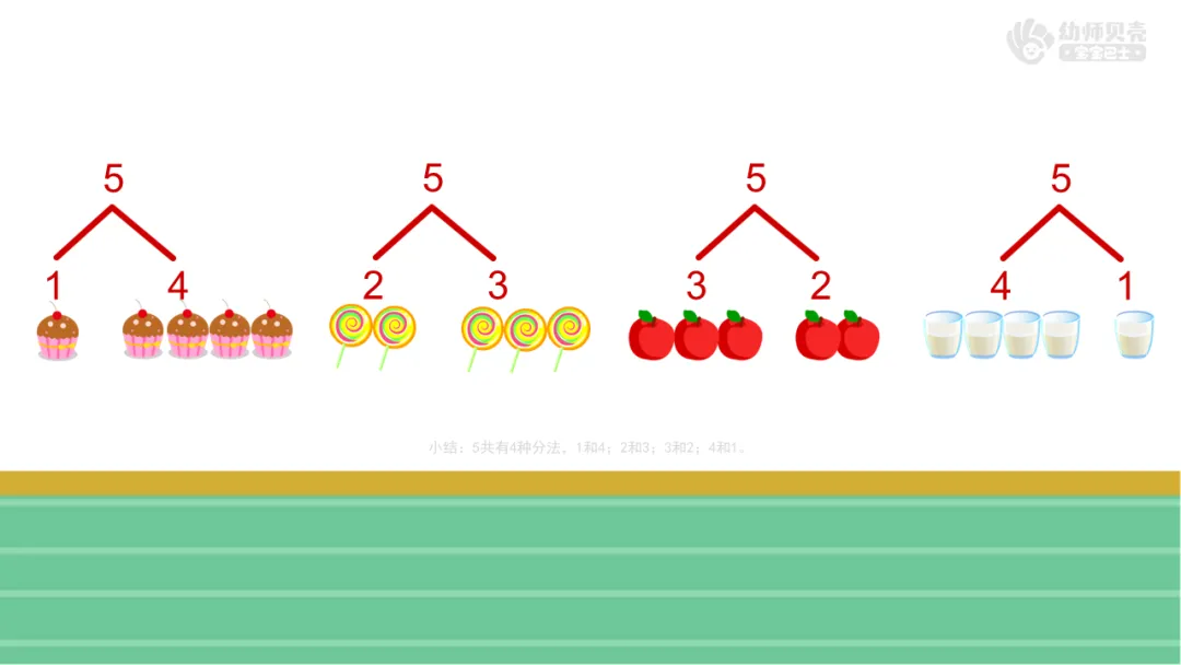 小结:5共有4种分法,1和4;2和3;3和2;4和1。