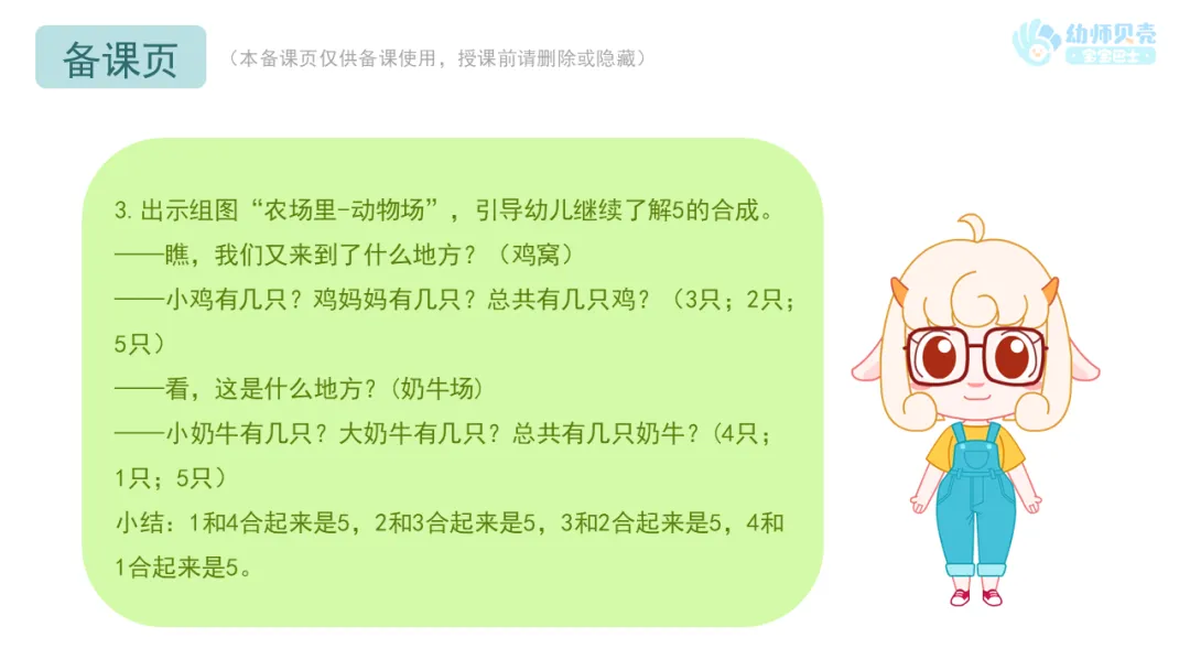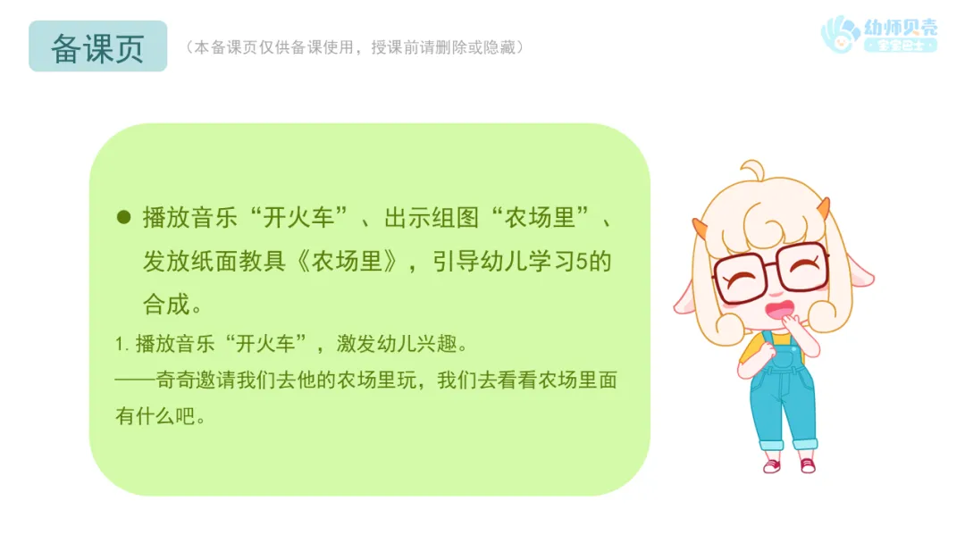 l播放音乐“开火车”、出示组图“农场里”、发放纸面教具《农场里》,引导幼儿学习5的合成。