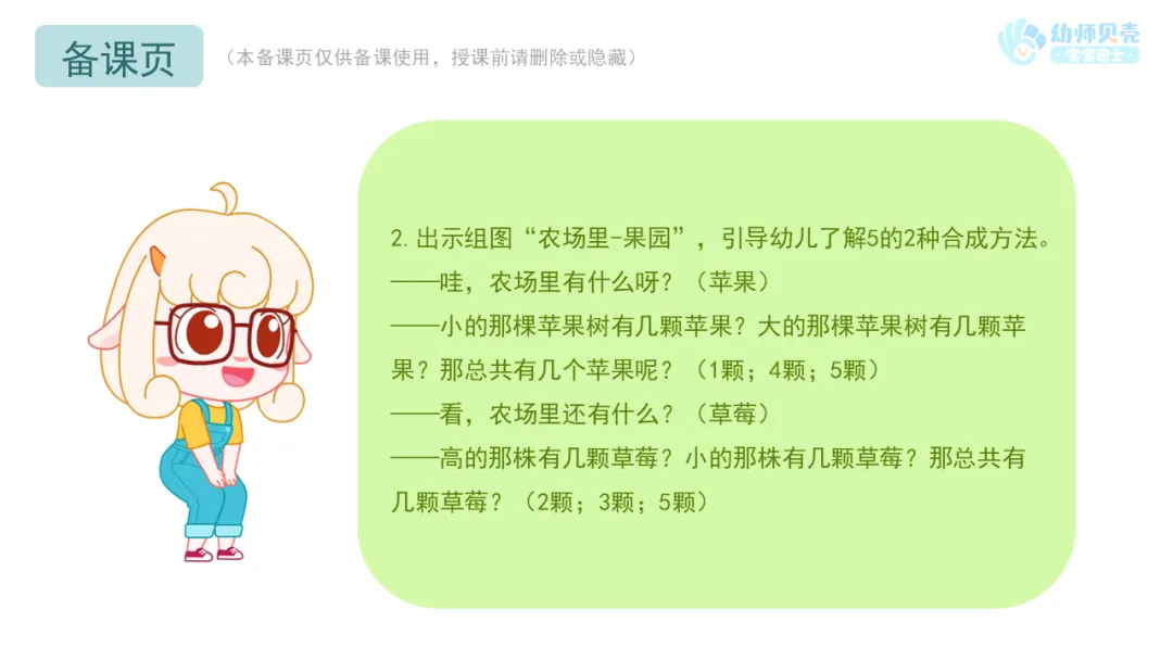 2.出示组图“农场里-果园”,引导幼儿了解5的2种合成方法。