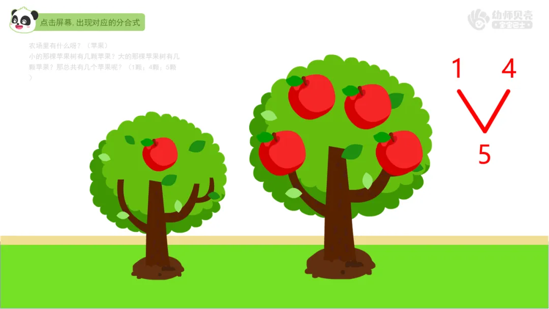 ——小的那棵苹果树有几颗苹果?大的那棵苹果树有几颗苹果?那总共有几个苹果呢?(1颗;4颗;5颗)
